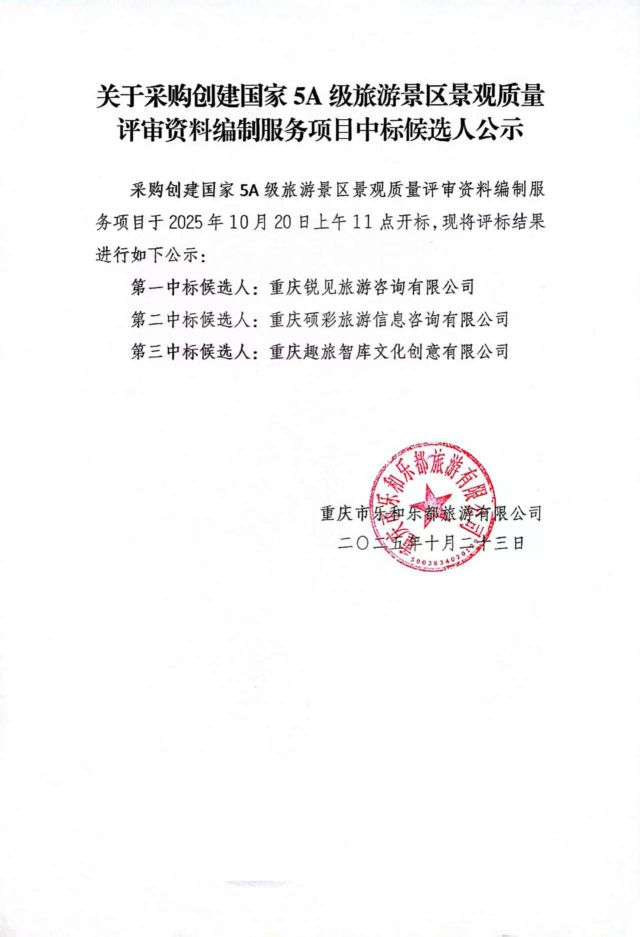 关于采购创建国家 5A 级旅游景区景观质量评审资料编制服务项目中标候选人公示