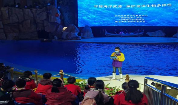 海豚与学生见面,海豚奶爸结合PPT科普海豚知识,着重保护海洋动物对于维护海洋生态平衡的重要意义 |